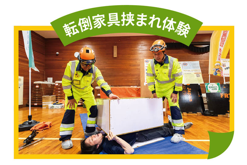 地震で家具が倒れ、下敷きになってしまう場面を想定した訓練です。体験を通じて、日ごろからの家具転倒防止の大切さを知りましょう。