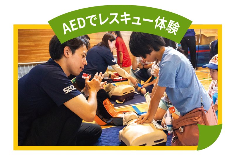 AEDの使い方と胸骨圧迫(心臓マッサージ)の方法を学べるコーナーです。街で見かけるAEDを、いざという時に使えるように家族で体験してみましょう!