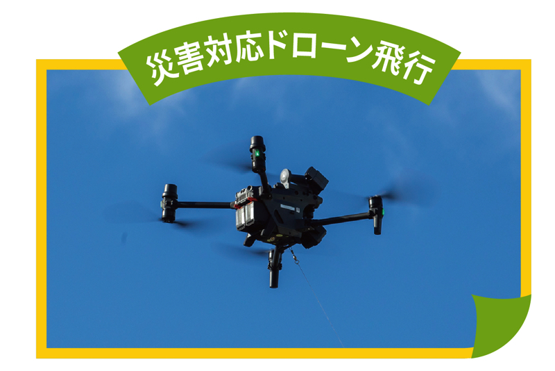 屋外にて、災害時に活用される防災ドローンの飛行練習を行います。赤外線カメラの映像や上空のドローンからの視点を大きなモニターで見てみよう!屋内でも防災ドローンの紹介をします。