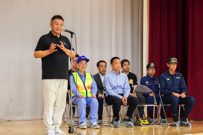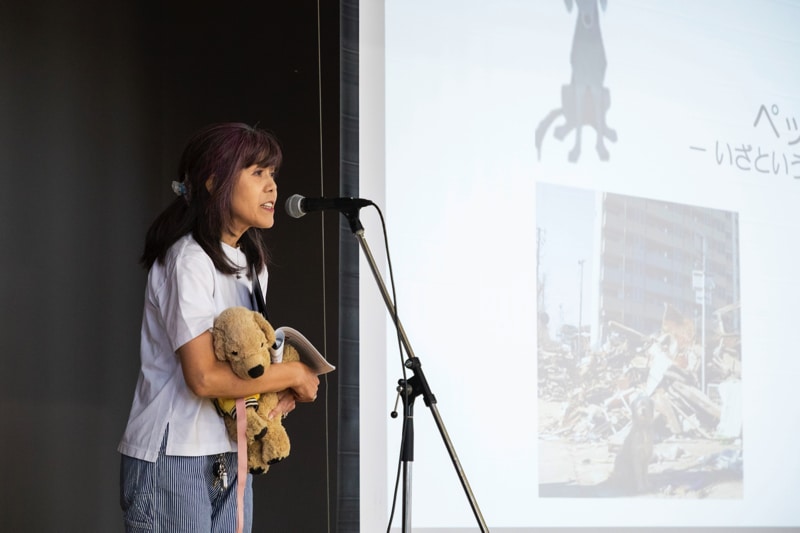 防災ステージでは、開会式の後、東京都愛玩動物協会代表・渡邉正美さんによる「ペット防災を学ぼう!」の講話が行われ、ペットとの避難や日頃の備えについて多くの保護者が耳を傾けました。続いて、渋谷区防災課による「渋谷の防災を考えよう」では、恵比寿地区の地形や災害リスクに即した具体的な備えについて解説がありました。