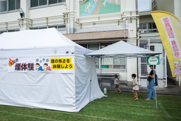 今年度の渋谷防災キャラバンでは初めての実施となる、「煙避難体験」が登場。火災時を想定した煙の中を実際に歩くことで、姿勢を低くして避難する大切さを学ぶ体験型の訓練が行われ、子どもたちも真剣な表情で取り組んでいました。