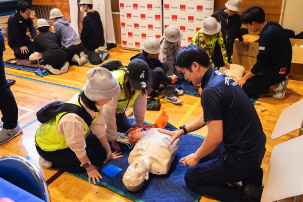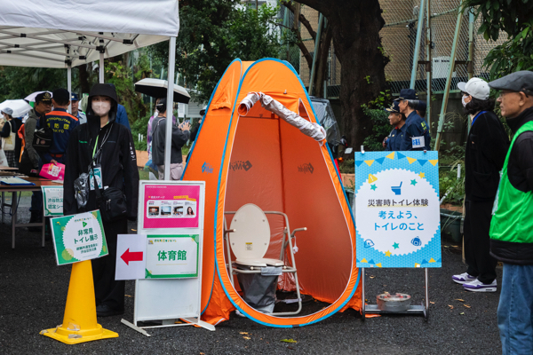 体育館周辺では、避難所運営委員会の方が主体となって、非常用トイレの組み立てや投光器の設置など、避難所運営に関する実践的な体験が行われました。また、避難所運営ブースでは、委員会の皆さんと一緒に防災マップを配布し、来場者に西原地区の防災情報を紹介。地域の備えを改めて確認し合うきっかけとなりました