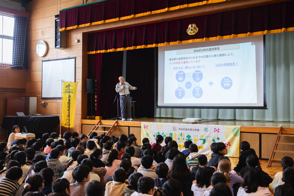 2025年10月25日(土)9:00〜12:00、西原小学校を会場に「渋谷防災キャラバン in 西原地区」を開催しました。当日はあいにくの雨模様となりましたが、西原小学校の全児童が参加し、学校公開日とあわせて多くの保護者も来場しました。児童・保護者・地域が一体となって防災を学ぶ機会となり、会場は活気にあふれていました。