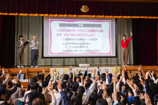 ステージの最後には、お笑い芸人の横澤夏子さんが登場。土砂災害や親子防災にまつわるクイズが出題され、トークでは子どもたちとの掛け合いや笑い声も交じる、にぎやかなステージになりました。